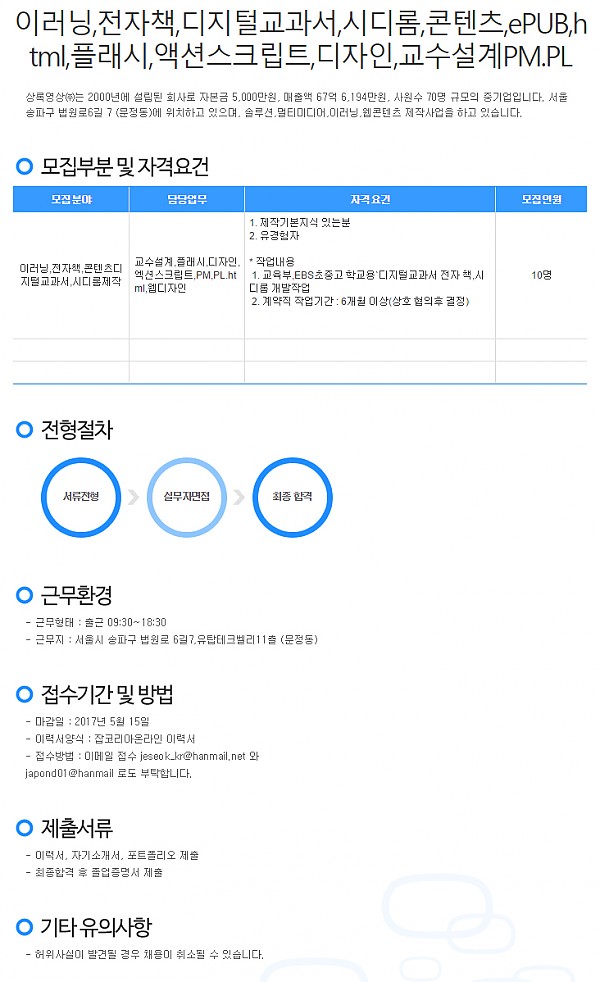 채용 진행중 | 이러닝,전자책,디지털교과서,시디롬,콘텐츠,ePUB,html,플래시,액션스크립트,디자인,교수설계 PM,PL